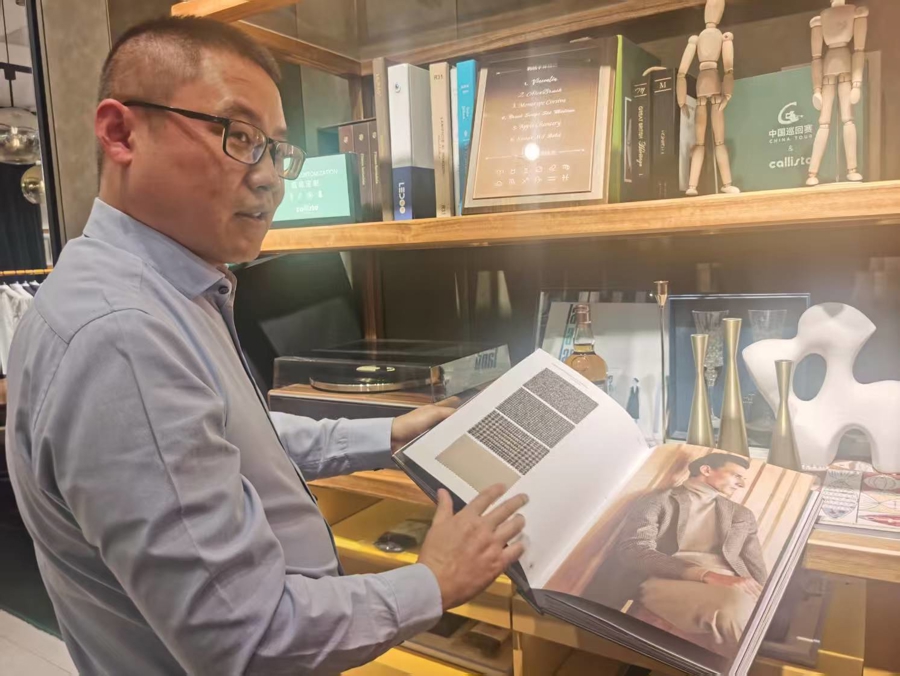 卡利斯特专柜的量体定制师于师傅,正在为即将到来的会员节活动准备定制面料册。